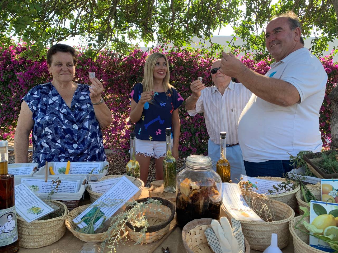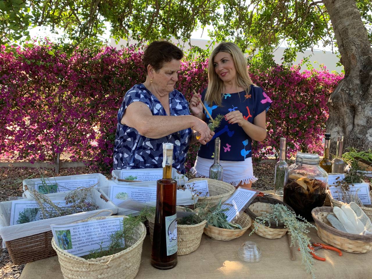 En esta ocasión, la abuela Catalina le desveló a Mar la receta secreta de nuestras hierbas payesas, contándole anécdotas sobre cada una de las plantas que iban introduciendo en la botella. En nuestra receta utilizamos 18 plantas diferentes que también cultivamos en nuestro pequeño botánico. Fue una suerte que la grabación fuese durante el mes de julio ya que el jardín estaba en pleno esplendor.