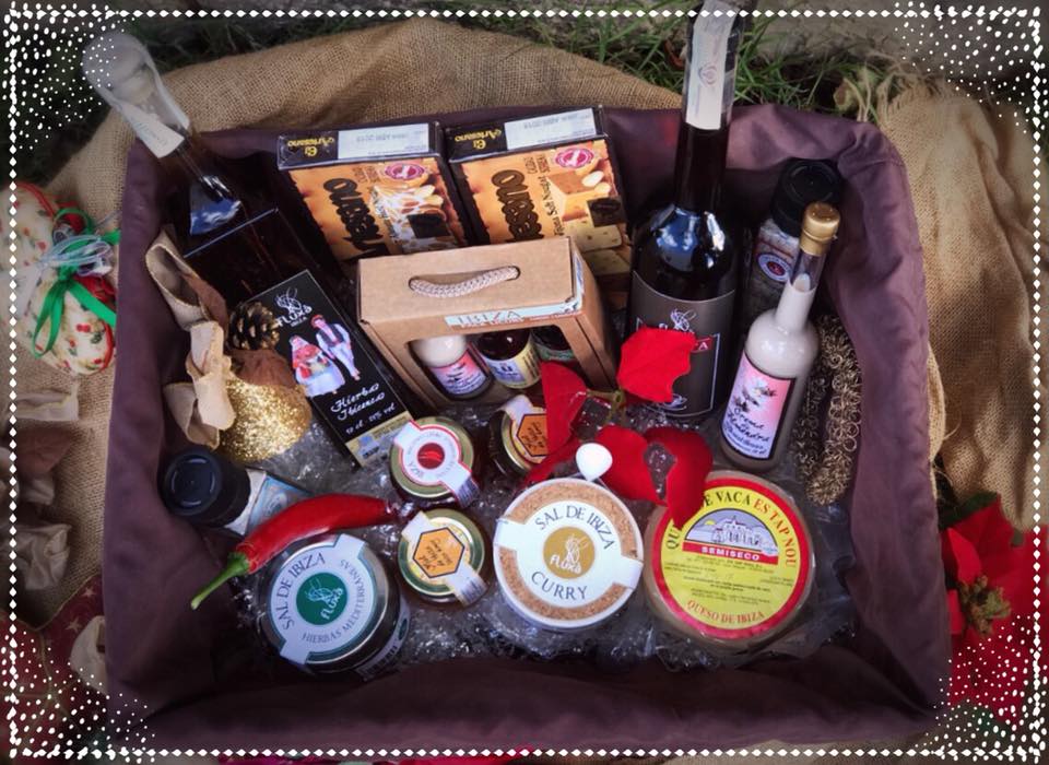 La cestita viene con un poco de todo: Nuestras Hierbas payesas de La Abuela, Caleta Coffee Liqueur, una selección de nuestros licores de Higos y de Almendrassal de Curry, sal de Hierbas MediterráneasDulce de Guindilla, miel y uno de nuestros molinillos de sal.